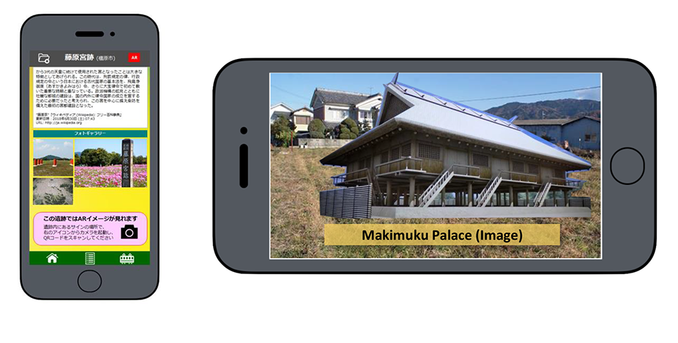 詳細な遺跡情報を提供可能なスマートフォンアプリによって、県外や外国人旅行者が、奈良の遺跡・古墳めぐりを楽しめる仕組みを提供します。奈良の遺跡・古墳に関する知識がなくても、用意されているテーマや地図のガイドに従って、興味を持つことのできる遺跡文化財に旅行者自身が発見して、観光を楽しめるアプリです。 - AR(拡張現実)